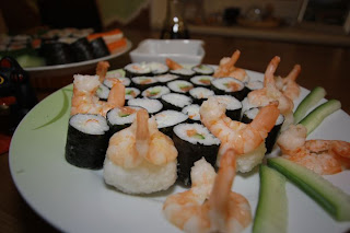 diesen Freitag waren Freunde da, die Sushi bisher nur aus dem Fernsehen kennen.. jeder konnte sich seine Sushi so zusammenstellen, wie er sie auch essen will, dass heißt, wir hatten auch Maki-Sushi (gerollte Sushi) nur mit Gurke und Möhre gefüllt.. ich persönlich bin ja Fan der Nigiri-Sushi (Reisball mit z. B. Fisch oben drauf), demnach habe ich mit den beiden Herren zusammen Nigiri mit Lachs, Thunfisch und Garnelen gemacht und der Liebste nahm sich der Mädels und den Rollen an..