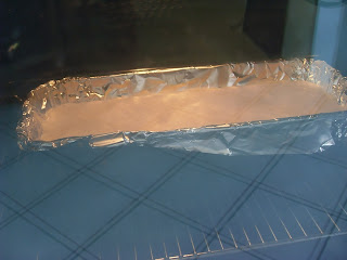 der Teig kommt in eine mit Alufolie ausgelegte Kastenform, deren Boden leicht bemehlt wurde.