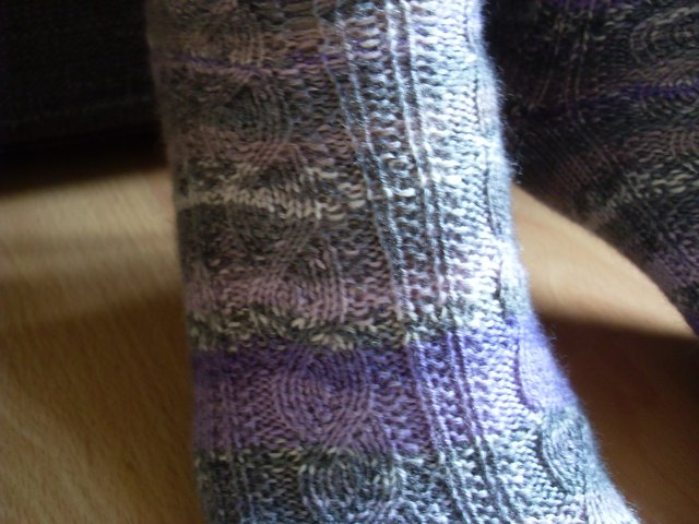 Babystrümpfe für einen kleinen neugeborenen Jungen in Dunkelblau/Dunkellila.. das Bündchen und der Fußspann sind im links-rechts-Muster gestrickt.. ich find’s hübsch und nicht zu verspielt für einen Jungen.. eigentlich wollte ich noch eine hübsche Bommel auf jede Socke setzen, aber ich hatte Befürchtungen, dass ich sie nicht fest genug angenäht bekommen, damit der Kleine sie später nicht abreißen kann.. verschluckbare Kleinteile und Kinder unter 3 Jahren und so, ne? ![]()