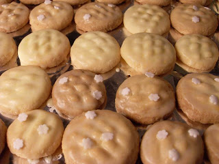 wer es gern süß hat, schmilzt einen fingerdicken Streifen Butter und verrührt ihn mit einer Packung Puderzucker.. nach Bedarf Milch dazugeben, damit der Guss streichfähig (und nicht krümelig…..) wird..